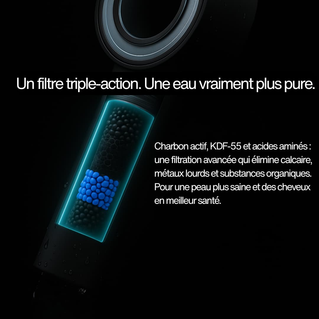 Le système multicouche élimine jusqu’à 90 % du chlore, du calcaire et des métaux lourds, pour une eau plus saine et plus douce.